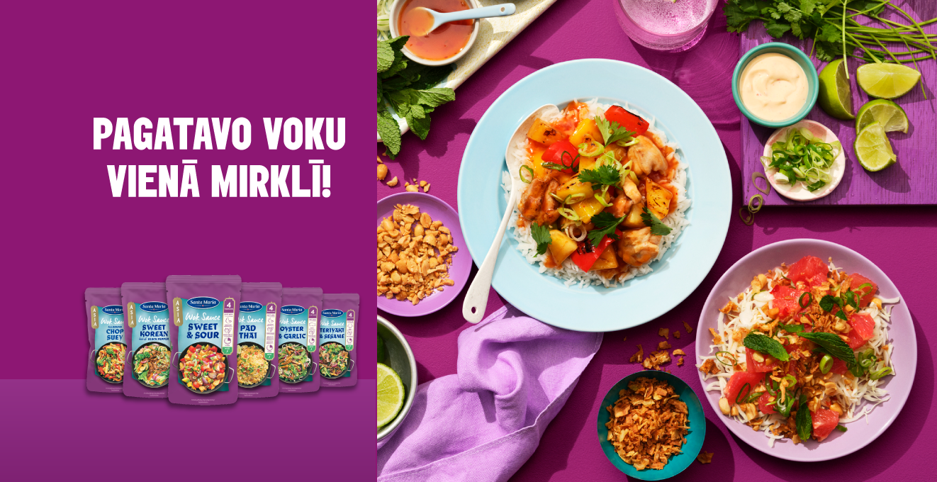 Pēc tam izvēlies mērci - kādu no Santa Maria jaunumiem : vok mērces Chop Suey, ar saldajiem Korejas melnajiem pipariem vai ar sezamu un terijaki vai mūsu Āzijas klasiku - saldskābo mērci, Pad Thai vai Āzijas garšvielas.